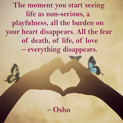 “The moment you start seeing life as non-serious, a playfulness, all the burden on your heart disappears. All the fear of death, of life, of love – everything disappears. One starts living with a very light weight or almost no weight. So weightless one becomes, one can fly in the open sky.” ~Osho